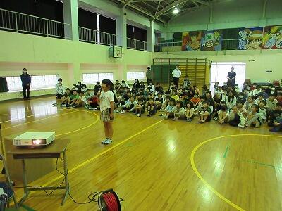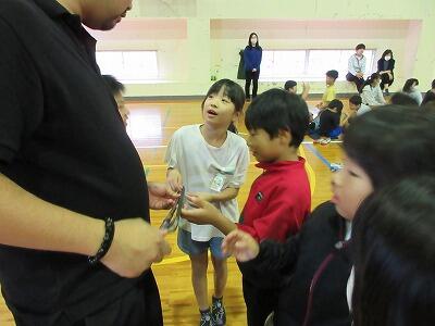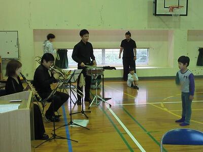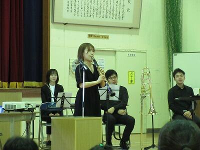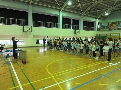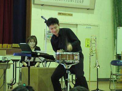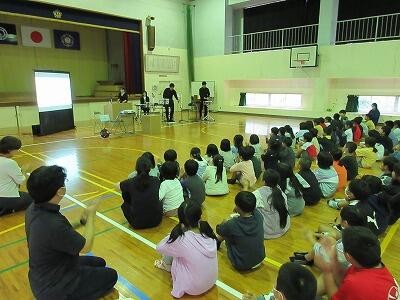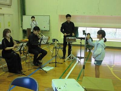 クラリネットとトロンボーン、打楽器の奏者による説明や演奏に子どもたちはとても喜んでいました。特に、小太鼓をいろいろなバチや手を使って高速で叩く演奏には目を(耳を)奪われていました。また、リズム打ちの練習や代表による指揮の体験もあり、あっという間に時間が過ぎました。11月の鑑賞教室が楽しみです(保護者や地域の方も参加できます)