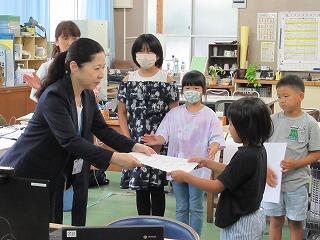 最後に、「川遊びイン五ヶ瀬川」スローガン応募で優秀賞をもらった4名の児童の表彰を行いました。