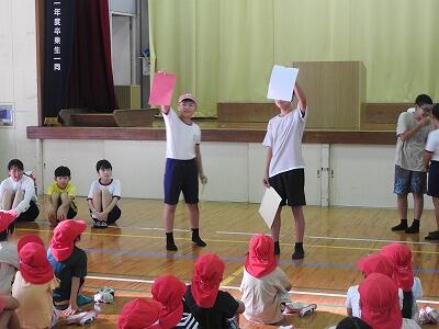 次に、団長と副団長になる6年生があいさつをしました。自分の団を優勝に導こうと意欲にあふれるあいさつでした。そしていよいよ団の色の発表です。リーダー全員で勝ち抜きじゃんけんをして、勝った方が封筒を選びました。封筒に中に赤と白の紙が入っていました。