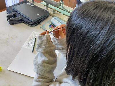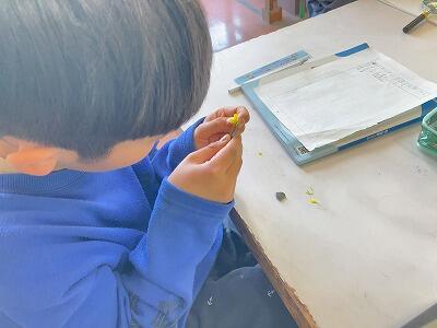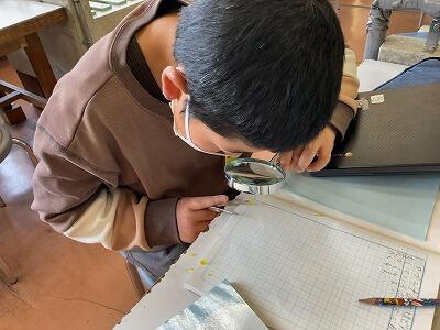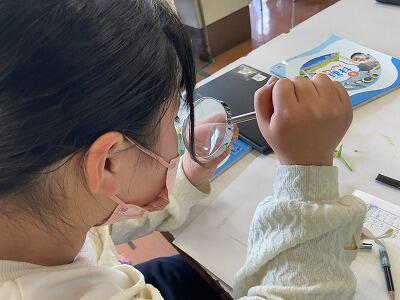 5年生が理科の学習でアブラナの観察をしていました。「花のつくり」という学習で、アブラナの花を細かく観察します。ピンセットで花を分解し、虫めがねで調べていました。春にぴったりの学習です。