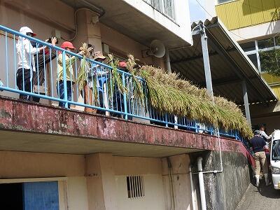 学校へ移動し、刈った稲を体育館のフェンスに並べました(かけぼし)。じゅうぶんに乾燥させたあと、昔の道具を使って脱穀をする予定です。