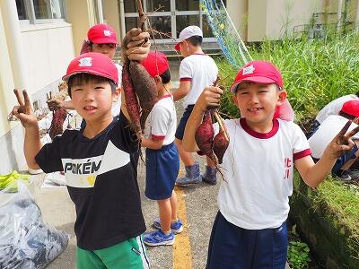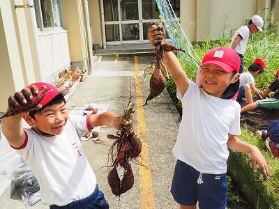 2年生が、教室の横で育てていたサツマイモの収穫をしました。