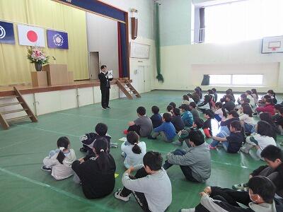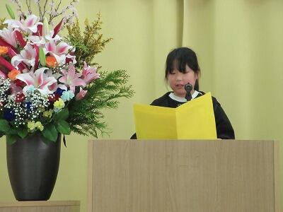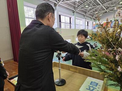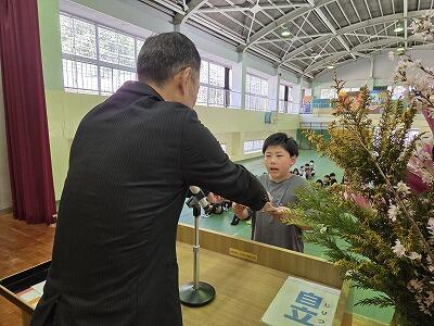 作文発表では、1年生と5年生の代表の児童が発表しました。1年生は、「昼休みにみんなで遊んだことが楽しかった。算数の計算をがんばった。読書もがんばっている。2年生になったら、入学してくる1年生のお手本となれるようにあいさつや返事、正しい姿勢をがんばりたい」と話しました。5年生は、お別れ遠足の代表あいさつに思い切って手を挙げた。むかばき宿泊学習で学んだことを生かすことができた。4月からは最上級生としていろいろなことにチャレンジしたい」と話しました。2人とも素晴らしい発表でした。