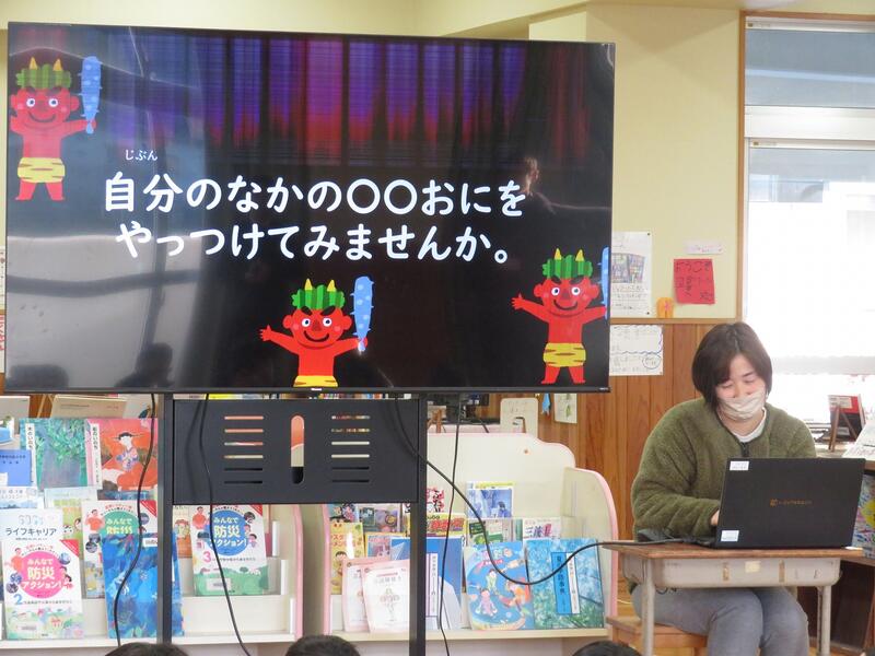 ↑2月のめあては「学習の苦手なところをやっつけよう」です。担当職員から「算数の苦手なところの練習をがんばってみよう」と楽しいスライドを使いながら話がありました。