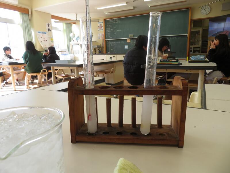 今日は4年生が理科の実験をしていました。「水を冷やし続けるとどうなるのか」ということで、水の入った試験管を、氷と塩の入ったビーカーに入れて変化を調べたようです。「水が凍ってしまった」「-12度まで冷たくなった」「体積が増えた」など、様々なことに気付いたようです。楽しそうでした。