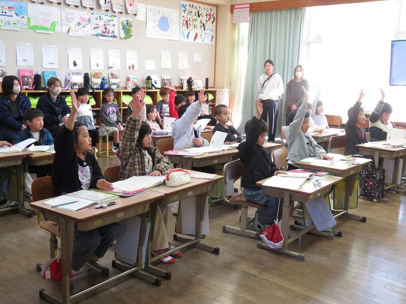 ↑まずは新入児・保護者のみなさんは1年生教室で学習の様子の参観です。教室の後ろの席に座って静かに学習参観ができた新入児のみなさんです。1年生もしっかり手を挙げて勉強していました。
