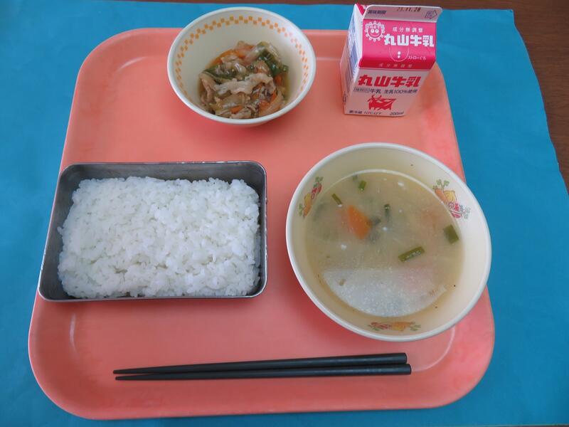 ↑ 今日の給食は、ごはん、牛乳、豚肉のしょうが炒め、団子汁 です。
