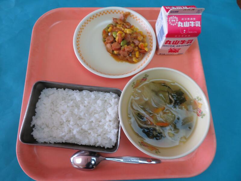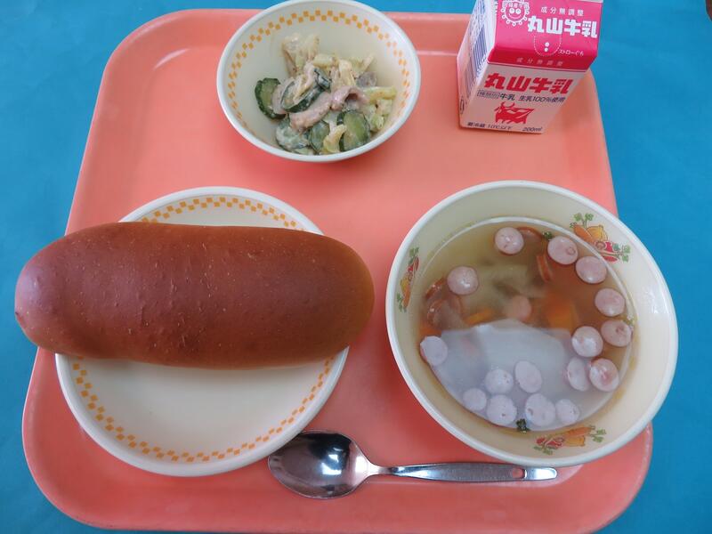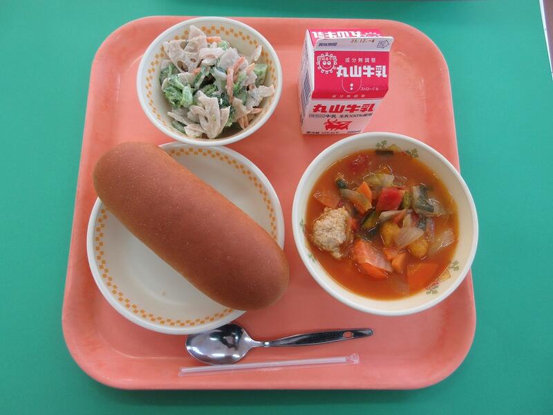 ↑ 今日の給食は、黒糖パン、牛乳、トマト鍋、れんこんサラダ です。