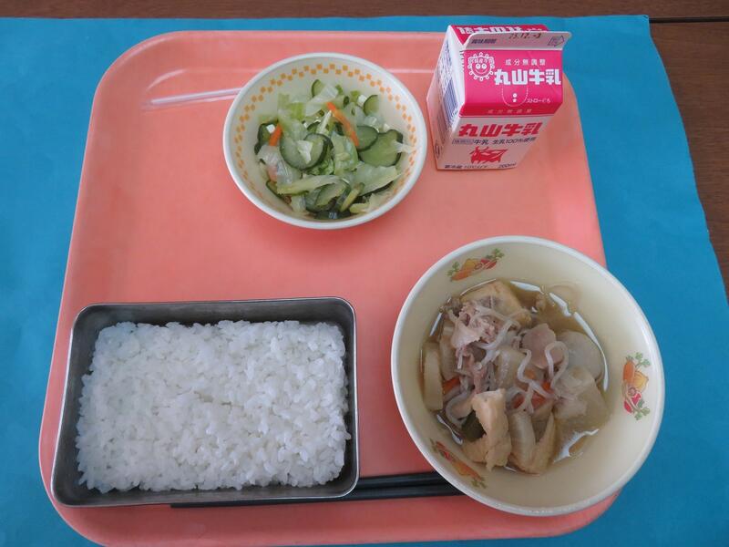 ↑ 今日の給食は、ごはん、牛乳、大根のうま煮、チーズサラダ でした。
