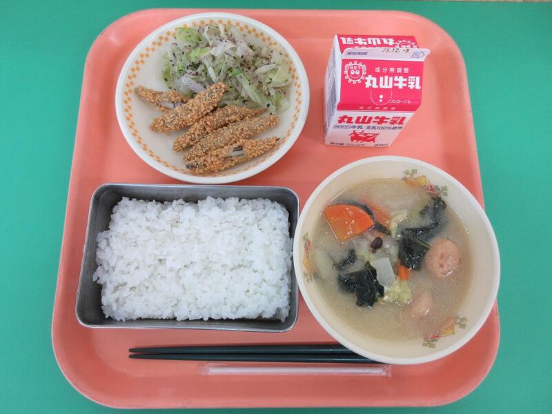 ↑ 今日の給食は、ごはん、牛乳、きびなごのカリカリフライ、ゆかり和え、がんもどきのみそ汁 です。