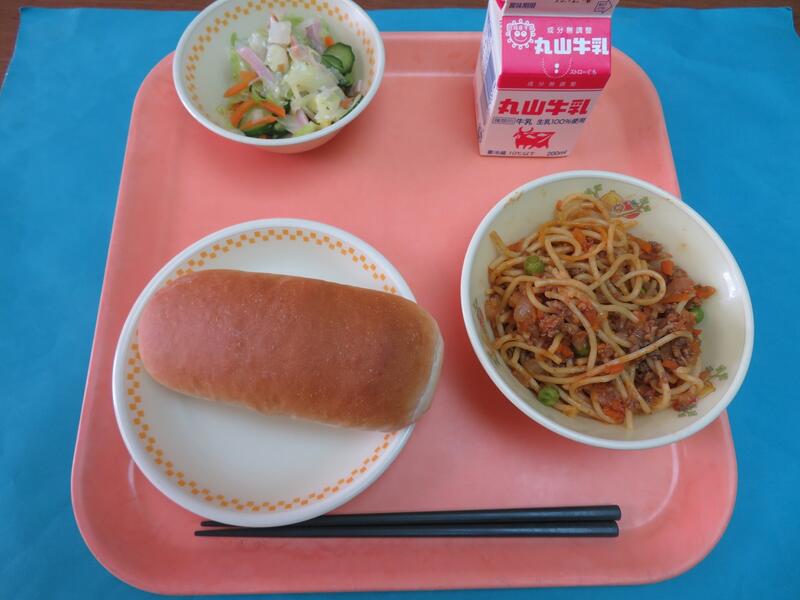 ↑ 今日の給食は、減量コッペパン、牛乳、ミートソーススパゲティ、日向夏ドレッシングサラダ です。