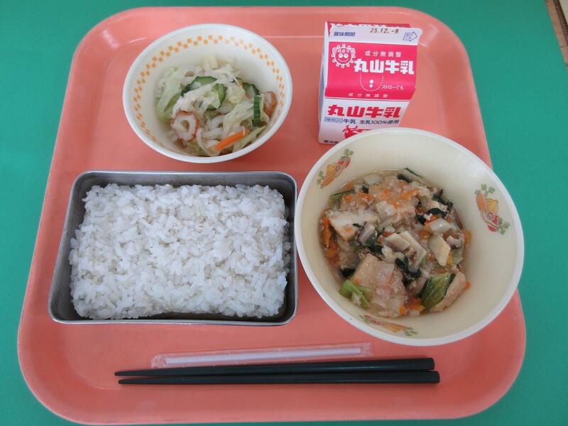 ↑ 今日の給食は、麦ごはん、牛乳、厚揚げの中華煮、千切り大根のラー油あえ です。