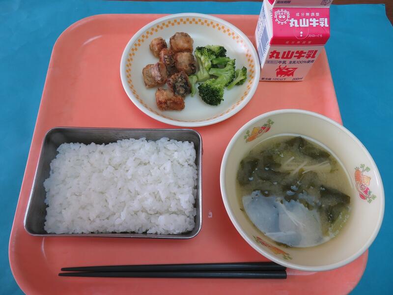 ↑ 今日の給食は、ごはん、牛乳、魚の唐揚げ、ゆでブロッコリー、おいもたっぷり汁 です。