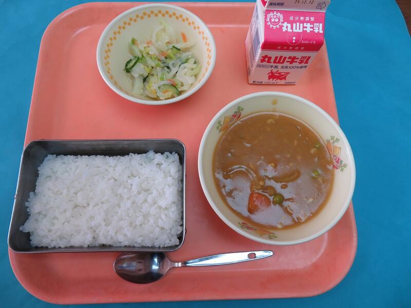 ↑ 今日の給食は、ごはん、牛乳、ミートボールと豆のカレー、冬野菜サラダ です。