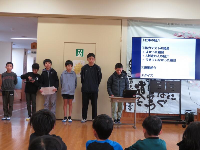 今朝は全校集会でした。今日は保健体育委員会の担当で、新体力テストでの体力賞受賞者の紹介、北浦小で全体的にできていなかった項目克服のための運動紹介がありました。