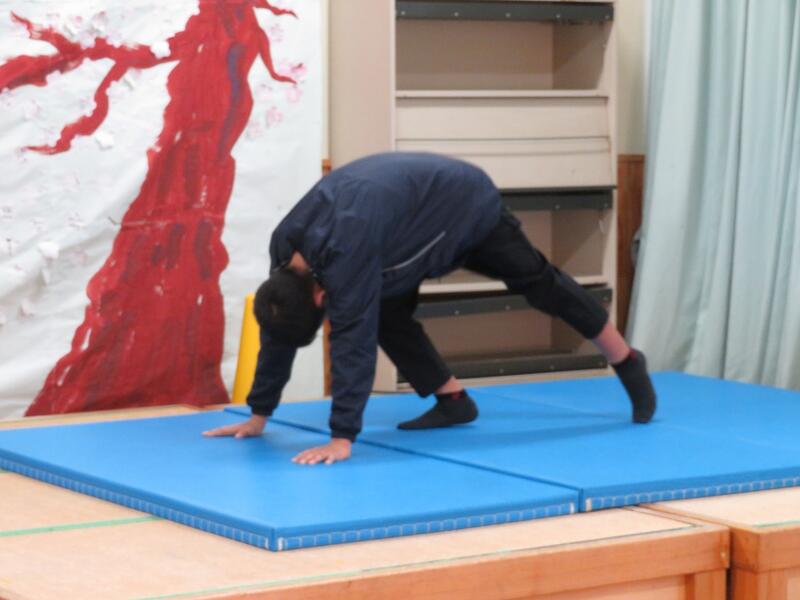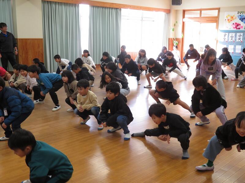 ↑本校児童は前屈等の柔軟性の結果がよろしくなかったようで、柔軟性を高める運動の紹介後、全児童で実際にやってみました。せっかく教えてもらったので、私も今後やってみます。