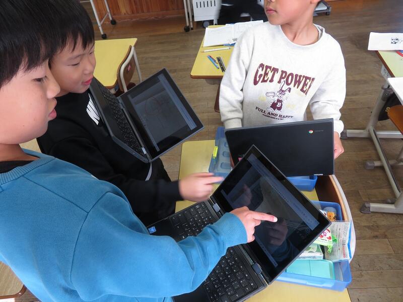 ↑2年生は算数の学習でした。自分の考えをタブレットを使って互いに説明していました。タブレットを扱うスキルの高まりを感じました。