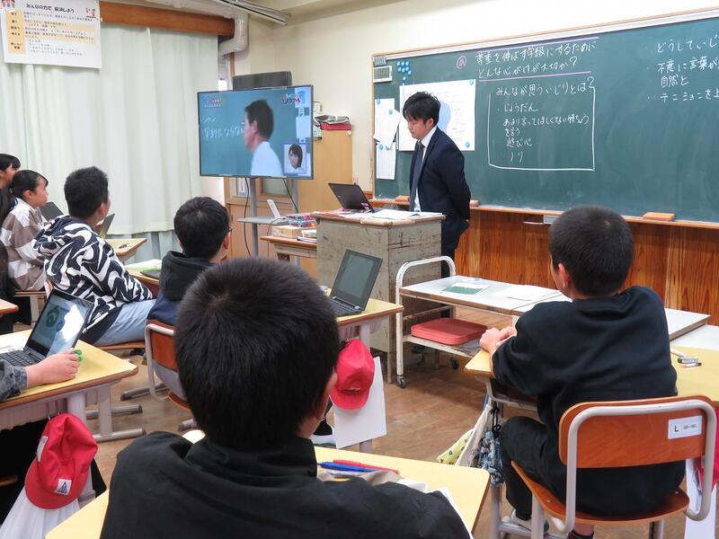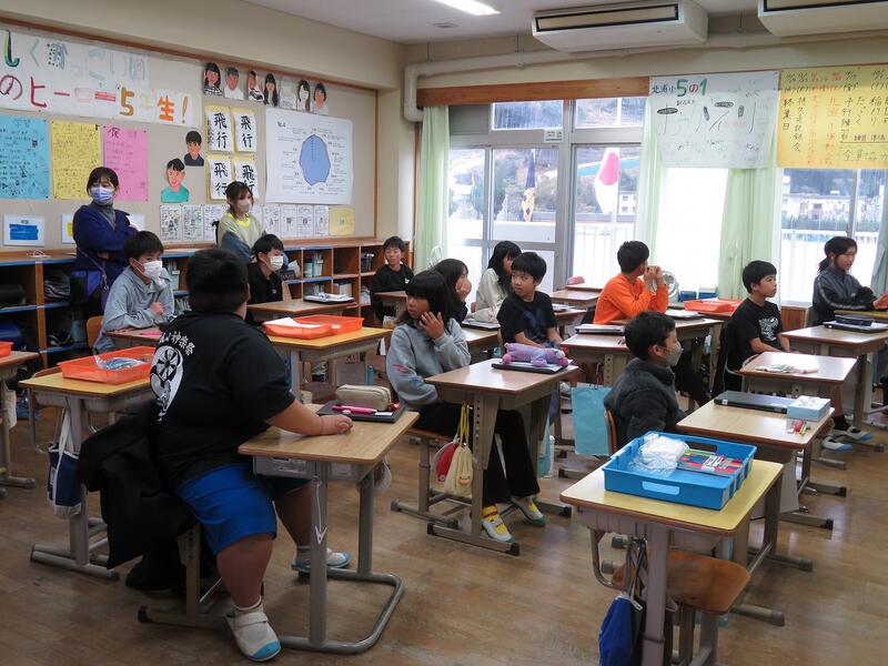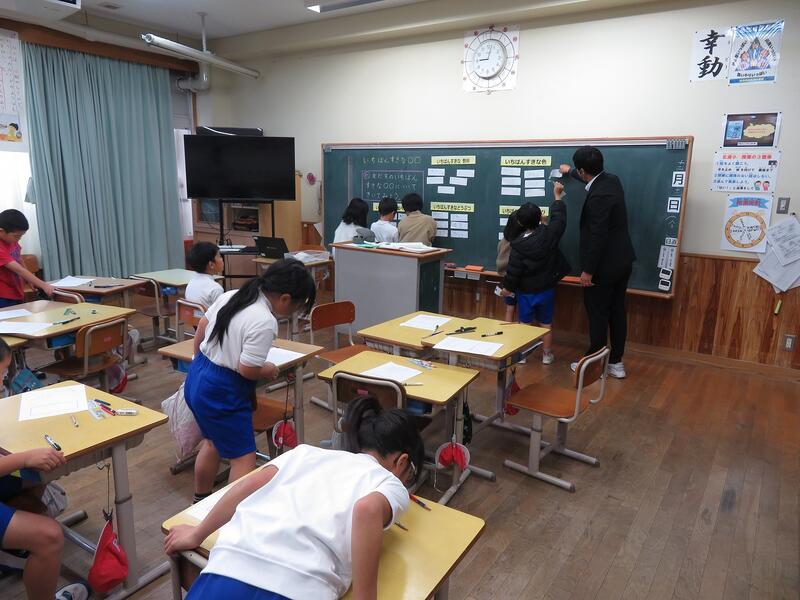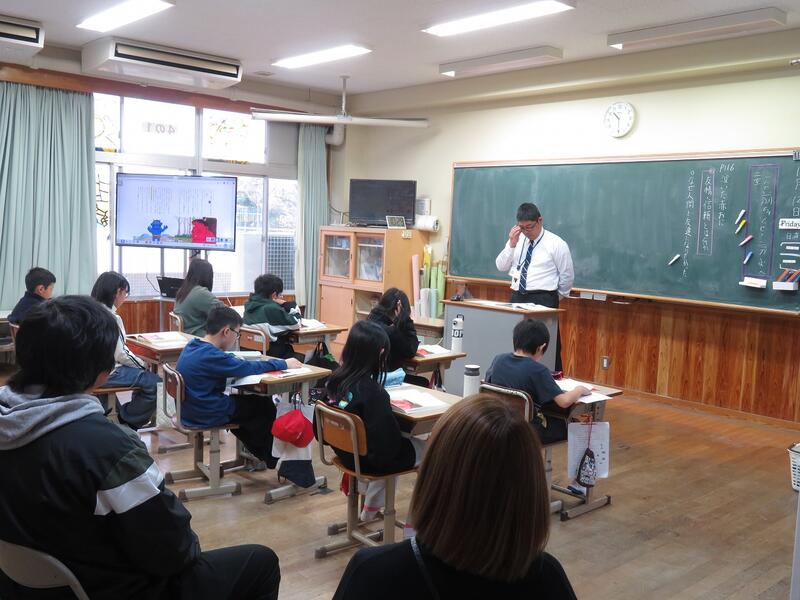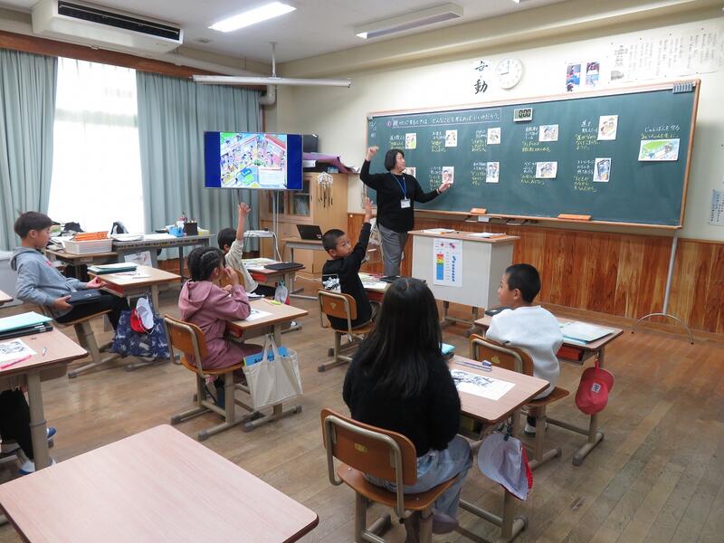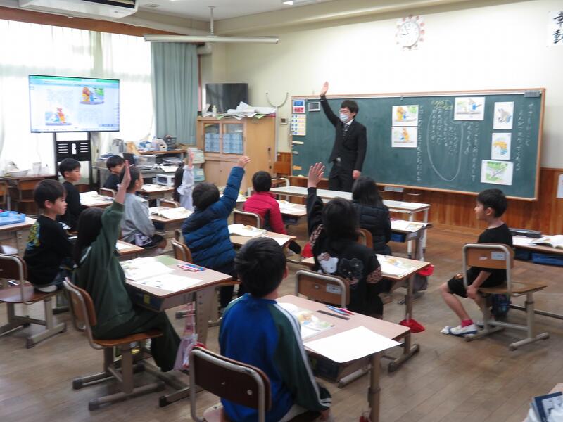 ↑1年生は道徳で「せかいのこどもたち」を学習していました。ALTのロバート先生も学習に参加してくださり、アメリカの学校の様子などを画像も使いながら説明してくれました。