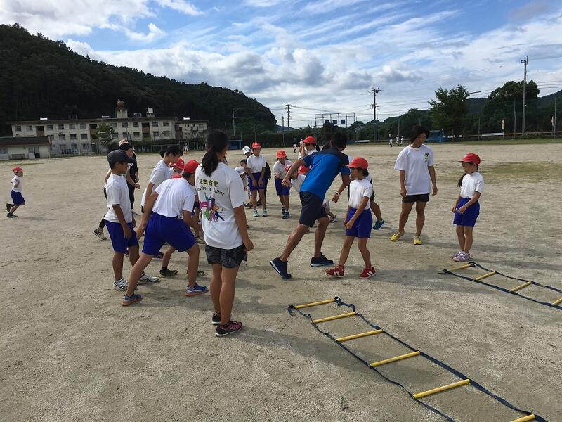ラダーを使った練習で、足の運び方、細かい回転のスピードをあげるなどの練習をしているところです。初めてやる練習で、児童も必死にやっていました。