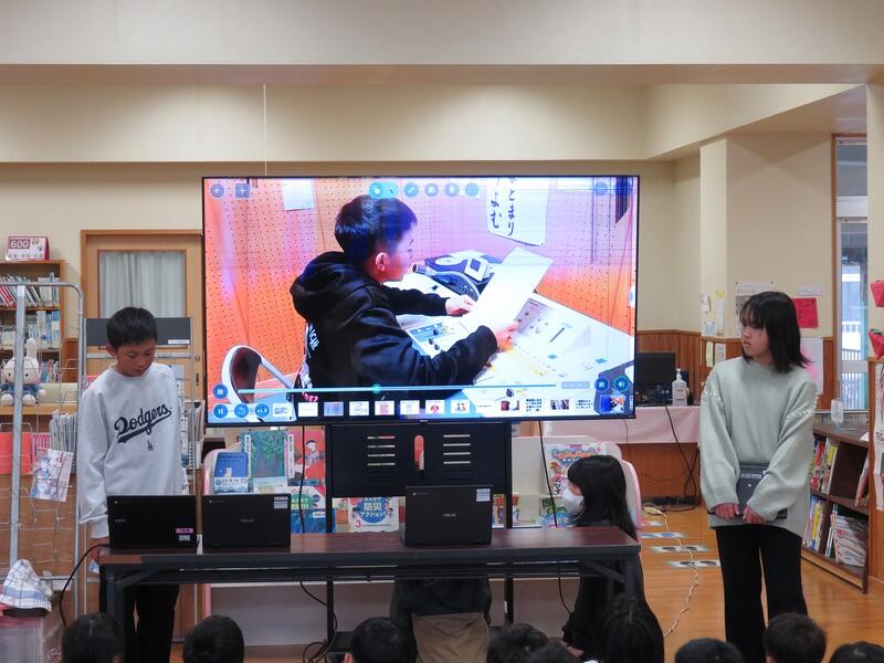 ↑1年生の教室では、高学年の図書委員会児童2名が優しく本を読んでいました。