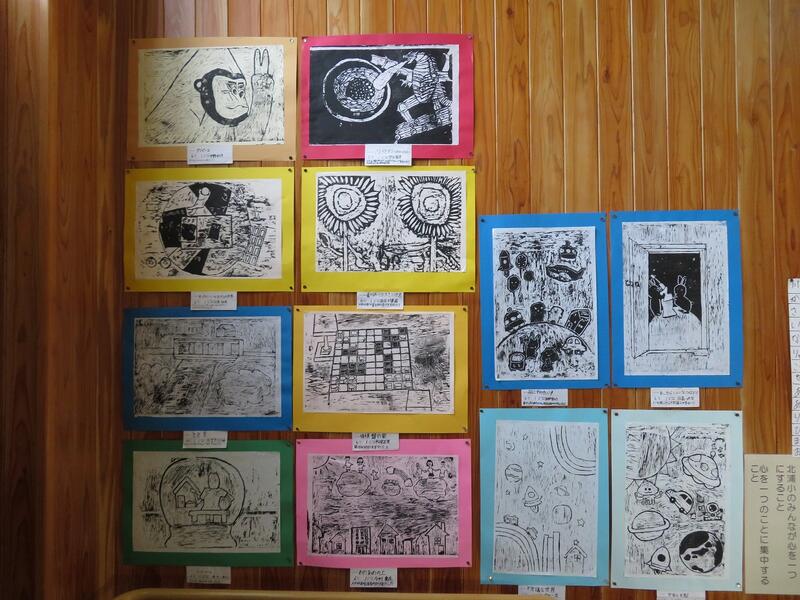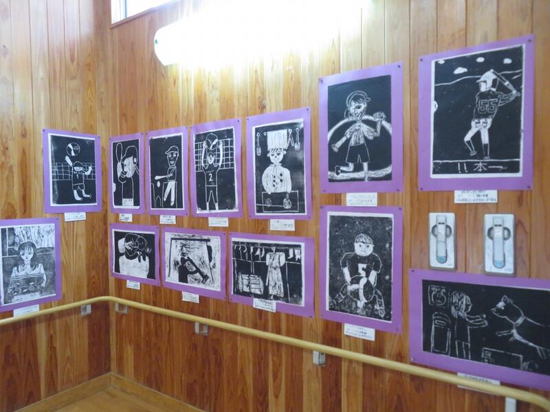 明日は参観日・PTAバザーの日です。階段掲示板には5年生と6年生の木版画が掲示されています。力作が並んでいますので、学校に来られたら是非ご覧ください。