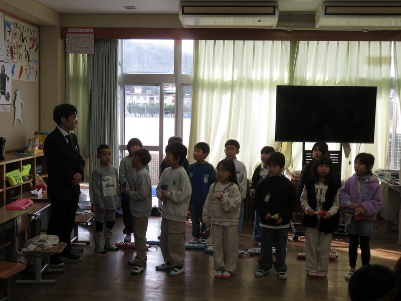 ↑ 4年生は「さんぽ」の曲を演奏した後、卒業を祝うメッセージを伝え、プレゼントを渡しました。