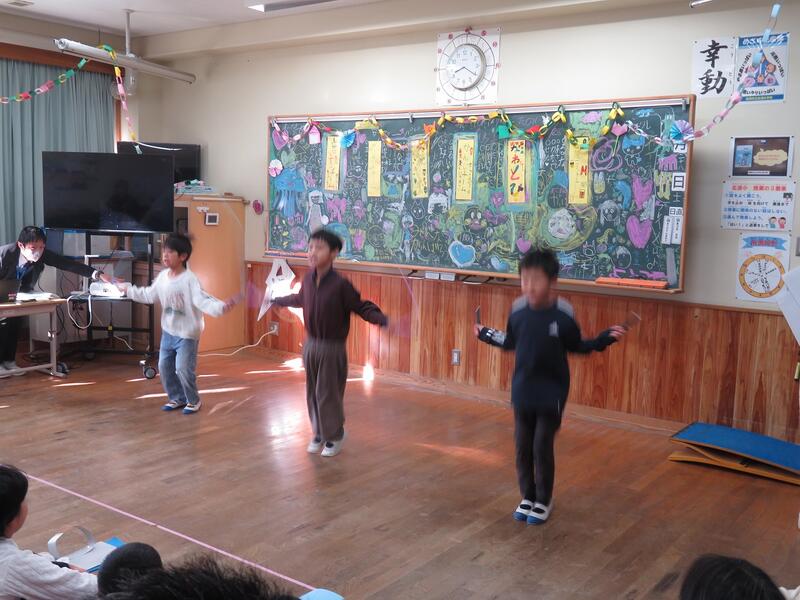 ↑2年生は縄跳び演技の披露、漢字クイズ、合唱などをがんばっていました。