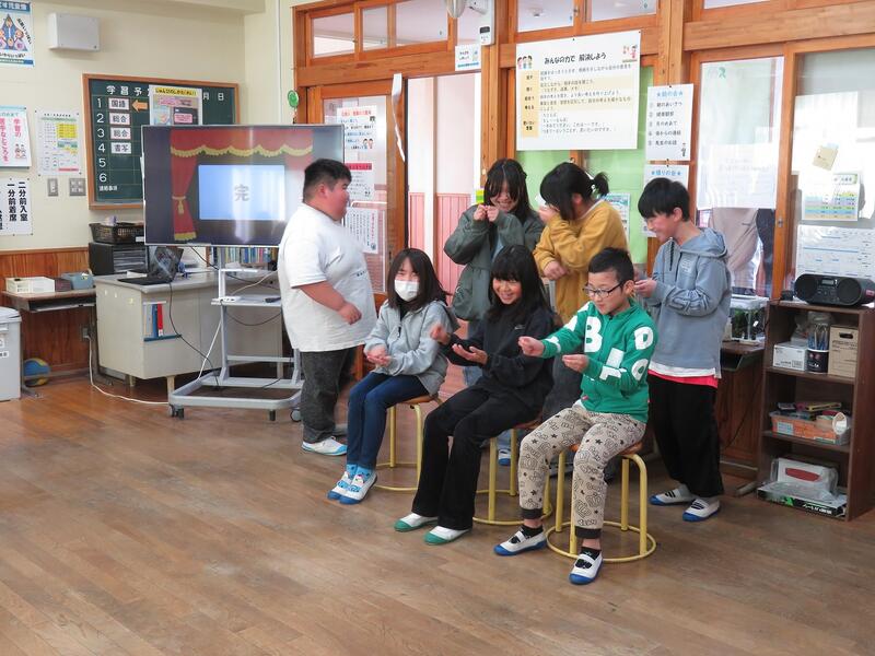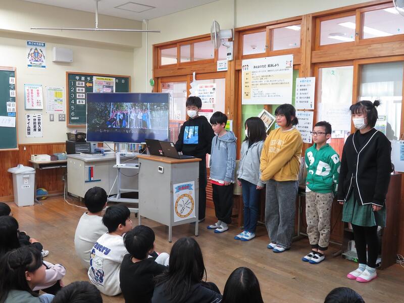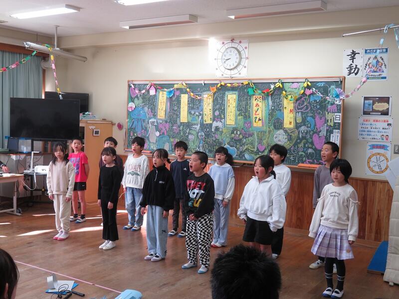 ↑ 学校に戻ってから、お別れ集会をしました。各学年から、卒業生に向けてのメッセージや歌、劇、クイズなどの出し物と、寄せ書きのプレゼントがありました。