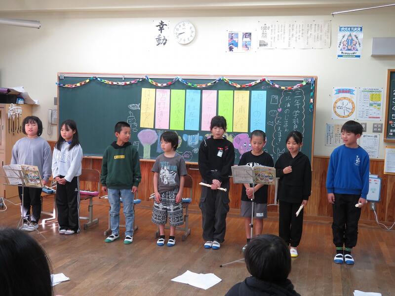 ↑3年生はこの1年間、「北浦の自慢をさがそう」という学習で、北浦にある様々な場所に見学に行ったり、いろんな方に学校に来ていただき授業に参加してもらったりしました。今日はお世話になった方々に学校に来てもらい、北浦の自慢を伝えていました。そして合唱・合奏のプレゼントもしたのです。
