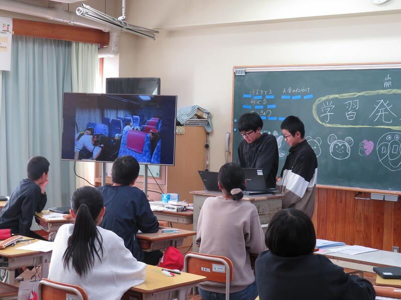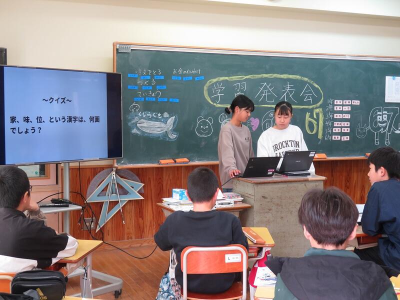 ↑4年生の社会の学習です。発表の練習をしていました。みんなで協力し合っています。