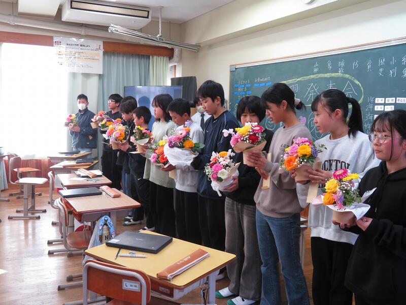 ↑6年生は6年間を振り返っての学習などでした。最後に一人一人が保護者へお花と手紙を渡す感動の場面もありました。