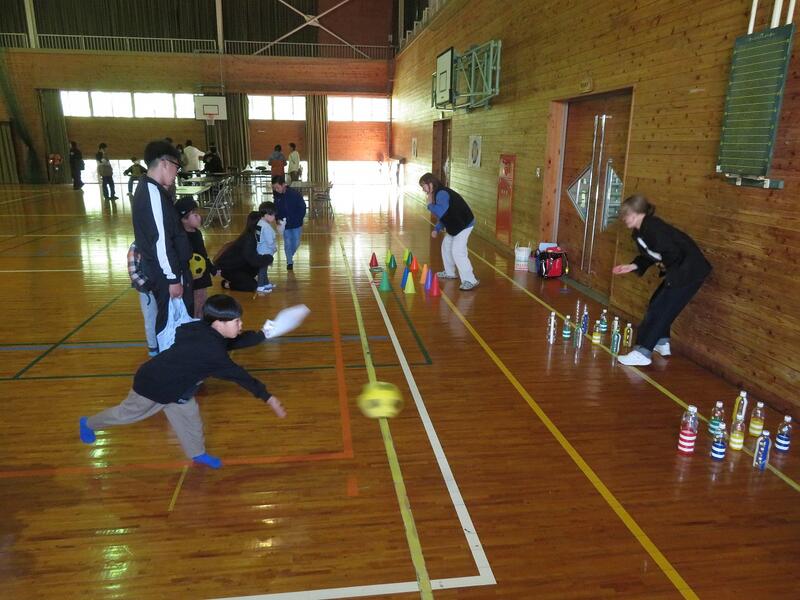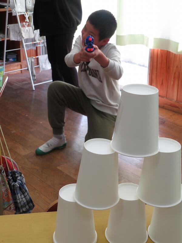 ↑6年生は外国語の学習をしていました。スポンジの飛ぶおもちゃの鉄砲でカップをねらって撃ち、学習した英語を使って話します。ロバート先生がいつも楽しいことを考えてくれます。スナイパーのような表情で子ども達は取り組んでいました。