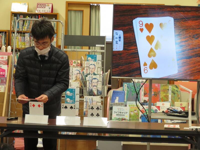 ↑まずは1年担任から、数のきまりを使った手品の紹介がありました。色々な法則などを知ることで1枚の札の数字が分かるようです。「身のまわりの様々なことに興味をもっていってください」という子ども達へのメッセージでした。