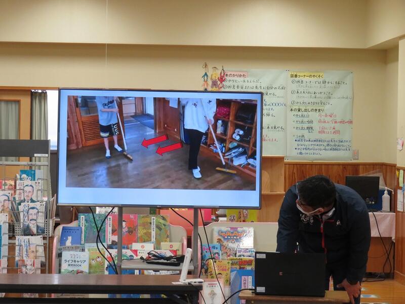 ↑続いて担当の職員から、3月のめあての「学校をきれいにしよう」についての具体的な説明です。掃除の一工夫を子ども達へ伝えていました。