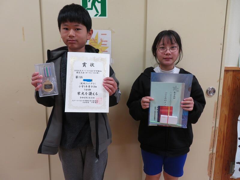 ↑最後に表彰です。「天下一!のべおか中学駅伝競走大会」の2Km小5の部で優勝した児童と、「あなたの大切な人へ伝えたい心のメッセージ」で作品が掲載された児童です。二人ともおめでとう!