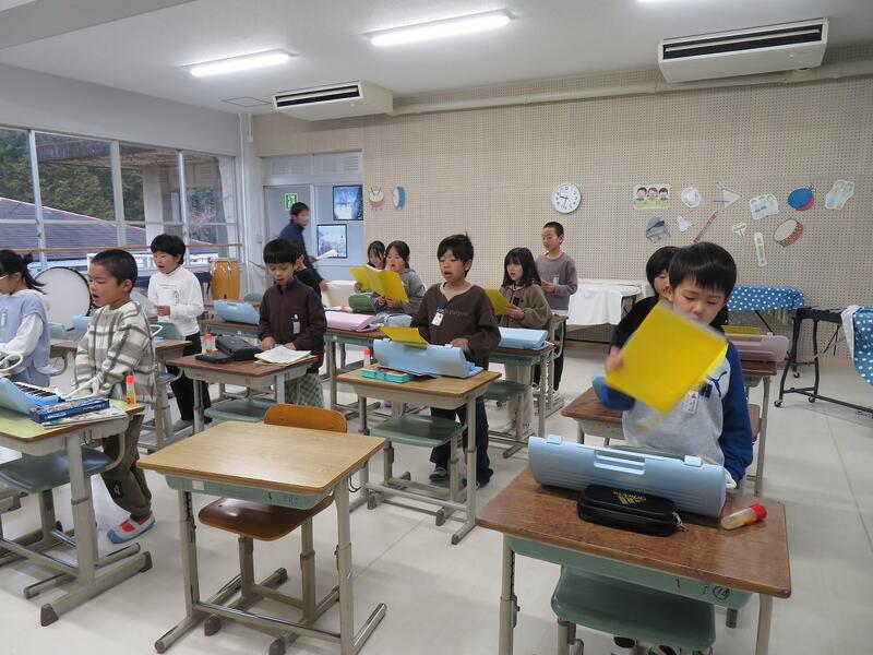 ↑2年生は音楽室で元気な歌声で歌っていました。