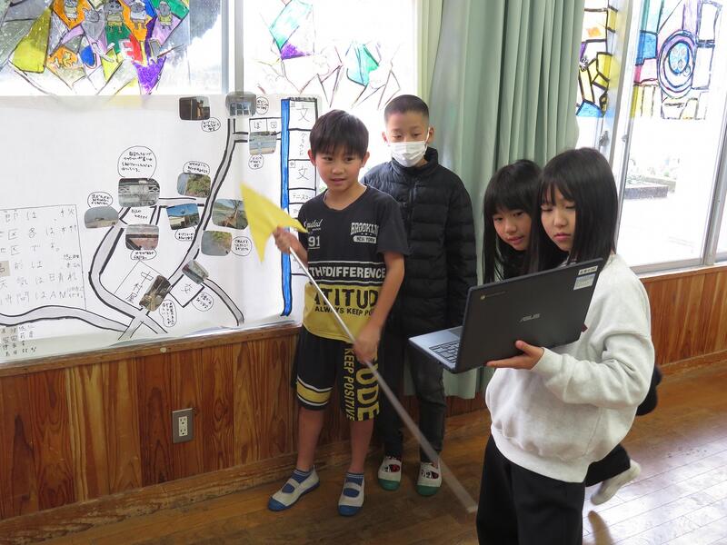 ↑まずは4年生児童が浜中地区・本村地区の危険箇所等を詳しく教えてくれました。調べることで「避難することの大切さ」「身を守ることの大切さ」に気付いたようです。