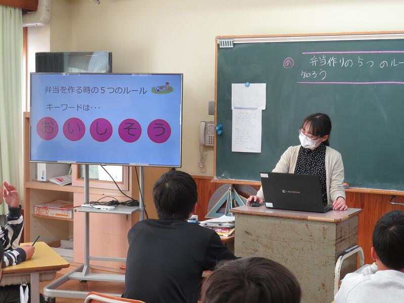 5時間目の6年生の教室をのぞいてみました。栄養教諭が金曜日の遠足「弁当の日」に向けての、お弁当作りについての学習指導をしていました。