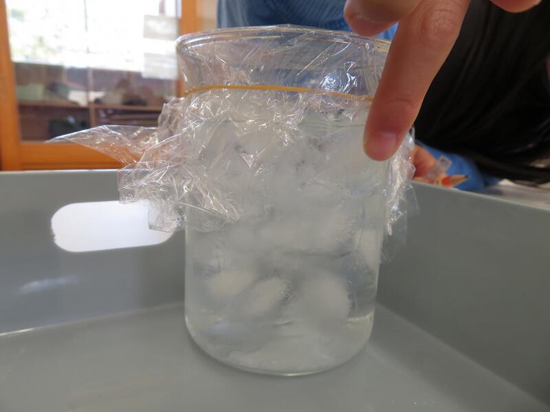 ↑4年生は理科の実験でした。「結露」について学んでいました。氷水の入ったビーカーの外側には、空気中の水蒸気が冷やされて水滴が付くことを確認していました。楽しそうでした。