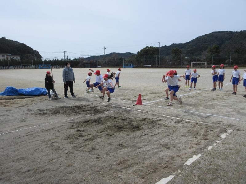 ↑ 2年生も、算数の学習を頑張っていました。3月に入り、どの学年もこれまでの復習やまとめに取り組んでいます。↑ 運動場では、3,4年生が、幅跳びの学習をしていました。空は少し曇っていますが、春の暖かさを感じます。