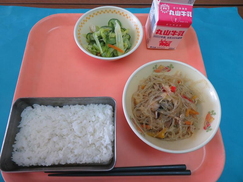 ↑ 今日の給食は、ごはん、牛乳、チャプチェ、バンバンジー です。