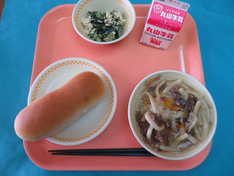 ↑ 今日の給食は、減量コッペパン、牛乳、肉うどん、変わり白和え です。