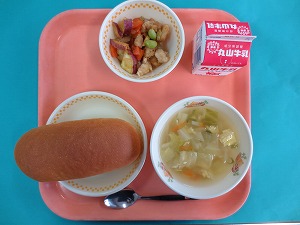 ↑ 今日の給食は、こくとうパン、牛乳、豚肉のゴマみそ和え、白花豆のスープです。
