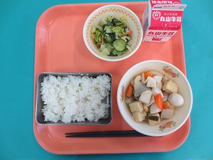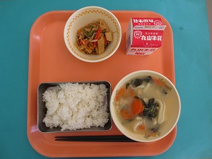 今日の給食は、ご飯、牛乳、鶏肉と厚揚げの味噌煮、磯香和えです。