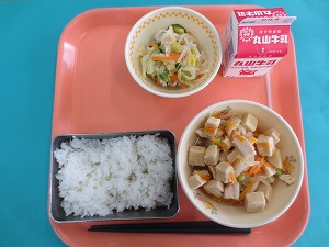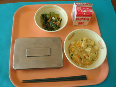 今日の献立は、ご飯、牛乳、豆腐の五目あんかけ、ひじきと牛蒡のサラダです。