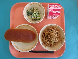 今日の献立は、げんりょうコッペパン、牛乳、やきそば、千切り大根のおかか和えです。