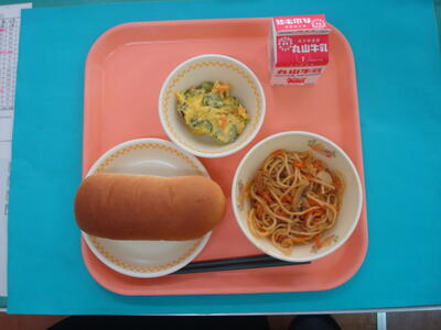 今日の給食は、減量コッペパン・牛乳・和風スパゲティ・キャベツのサラダです。