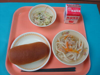 ↑ 今日の給食は、減量コッペパン、牛乳、肉うどん、ごぼうサラダです。