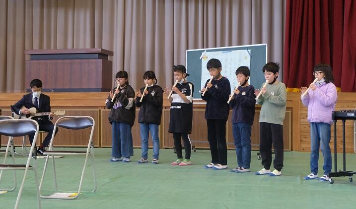 5人の児童代表(5年:吉田瑠育くん、4年:中口優くん、3年:髙須佳乃さん、2年:波越幸之介くん、1年:波越芽咲さん)が壇上で修了書を受け取りました。そのあとには、2人の代表児童が1年間を振り返っての作文を発表しました。