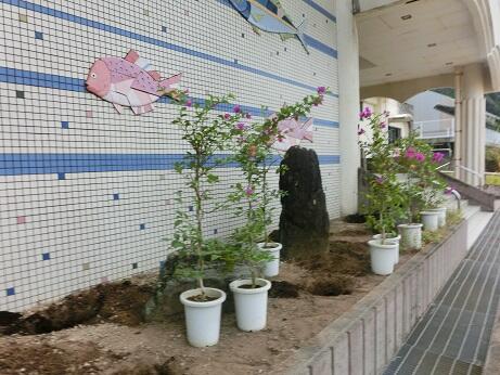 学級園に植えられました。校長室前にもプランターが並べられ、